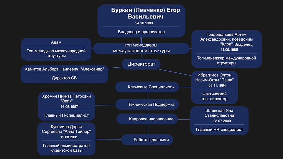 • Буркин (Левченко) Егор Васильевич — считается основным бенефициаром всей преступной схемы. В настоящее время объявлен в международный розыск через Интерпол.